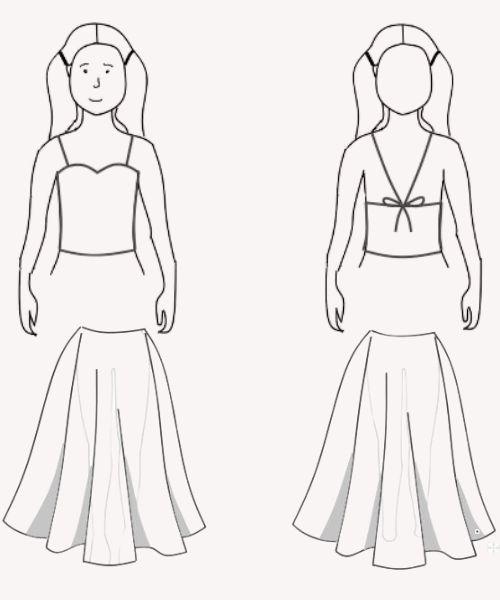 Haut encolure cœur et bretelles nouées · Jupe asymétrique courte devant, longue derrière