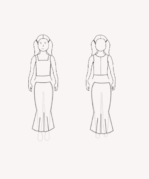 Entre lignes droites et courbes infinies, ce modèle marie la rigueur d’un haut à encolure carrée et la fluidité d’une jupe sirène.