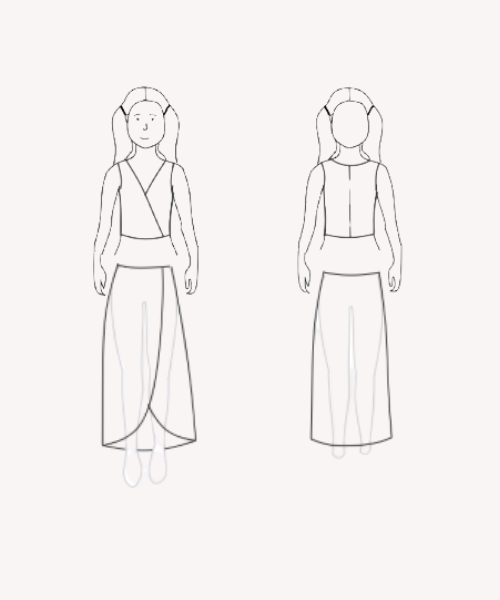 Le haut cache-cœur vient envelopper délicatement la silhouette, tandis que la jupe portefeuille joue sur l’équilibre entre fluidité et praticité.